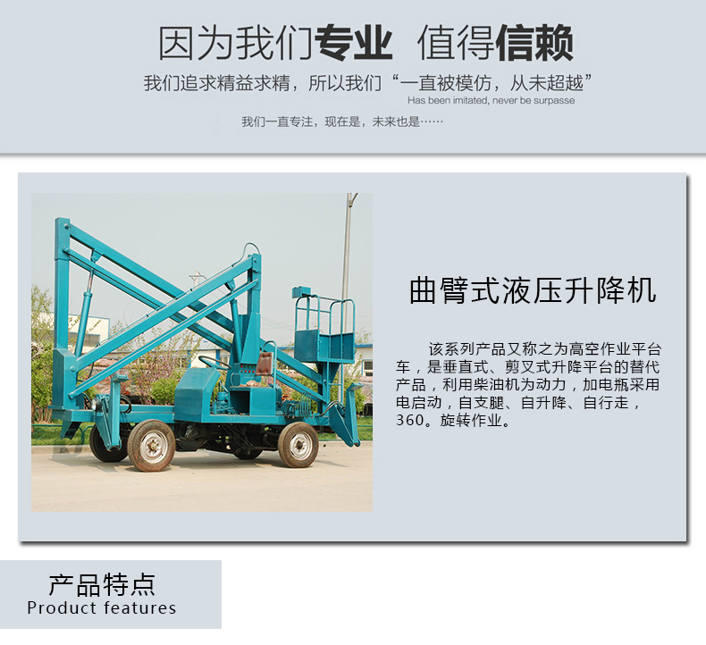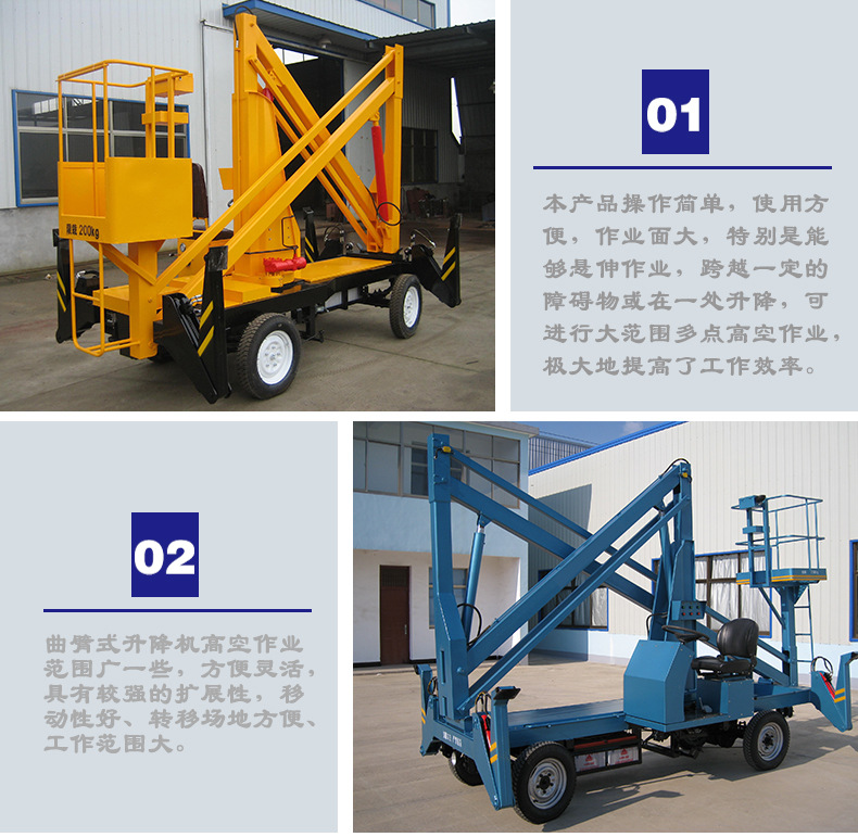曲臂升降机又称之为高空作业平台车,是垂直式、剪叉式升降平台的替代产品,利用柴油机为动力,加电瓶采用电启动,自支腿、自升降、自行走,360度旋转作业。操作简单,使用方便,作业面大,特别是能够悬伸作业,跨越的障碍物或在一处升降,可进行大范围多点高空作业,地提高了工作效率。