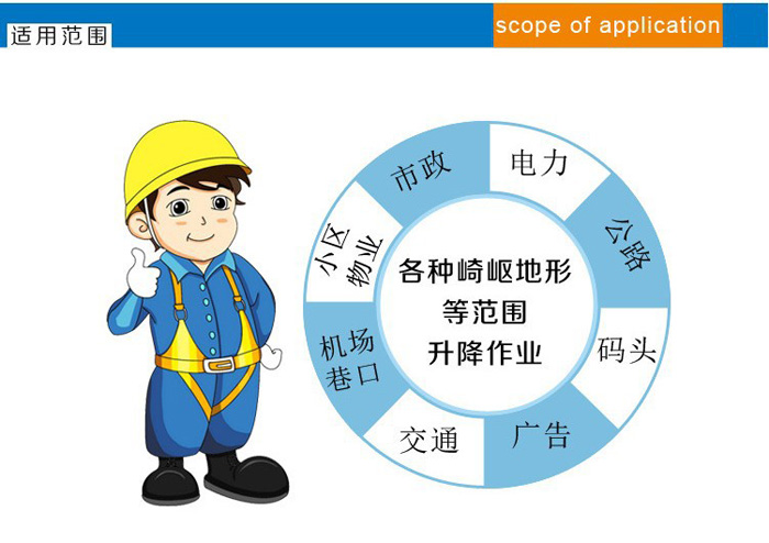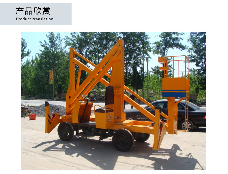广泛用于市政、电力、路灯、公路、码头、广告、交通、机场巷口、园林、通讯、摄影、小区物业、厂矿企业车间、野外各种崎岖地形等范围升降作业。