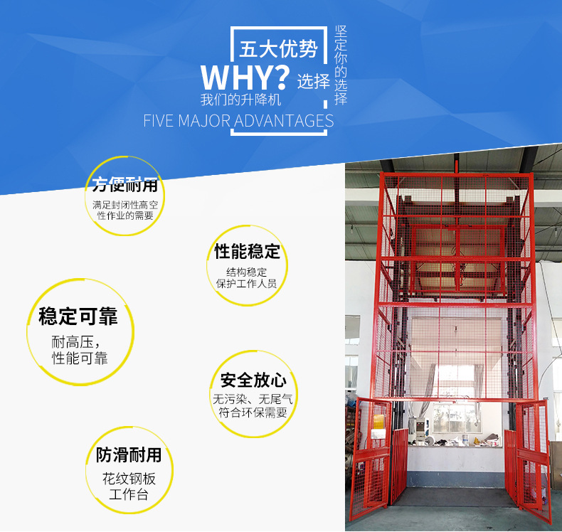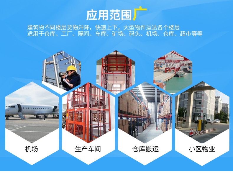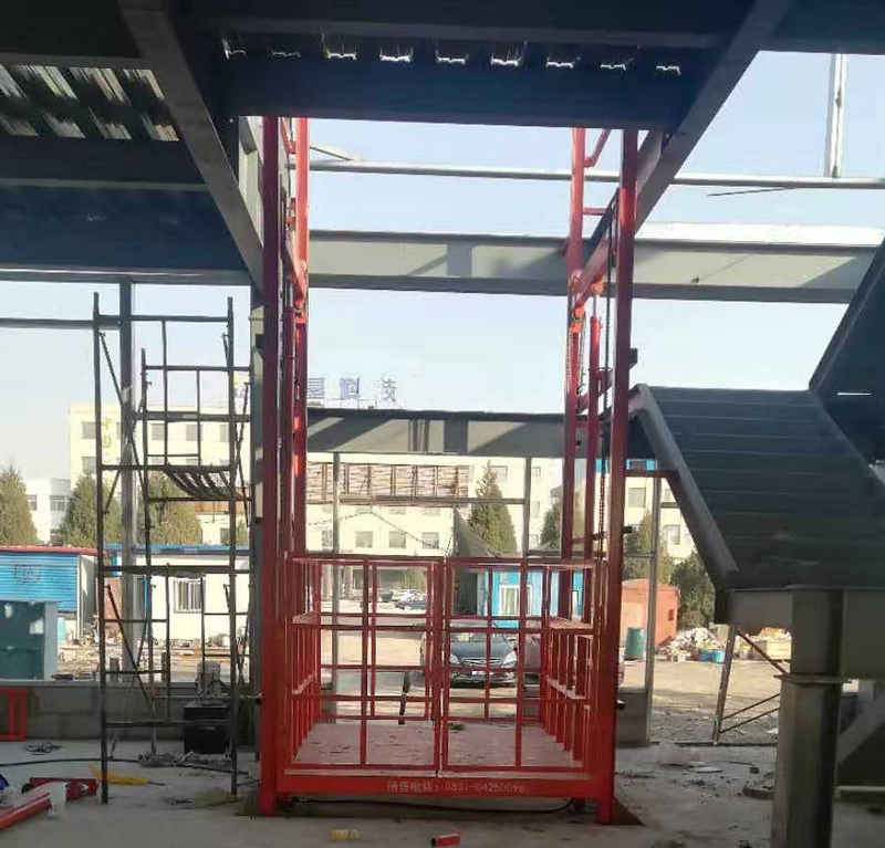 导轨式升降货梯是用于货物升降的液压升降机械设备,釆用液压站作为主要动力,液压油缸作为支撑,T型导轨作为轨道,通过特种链条和滚轮传动,保证轿箱运行安全稳定。无需地坑和机房,特别适合于有地下室、仓库改造、新建货架等,具有安装维